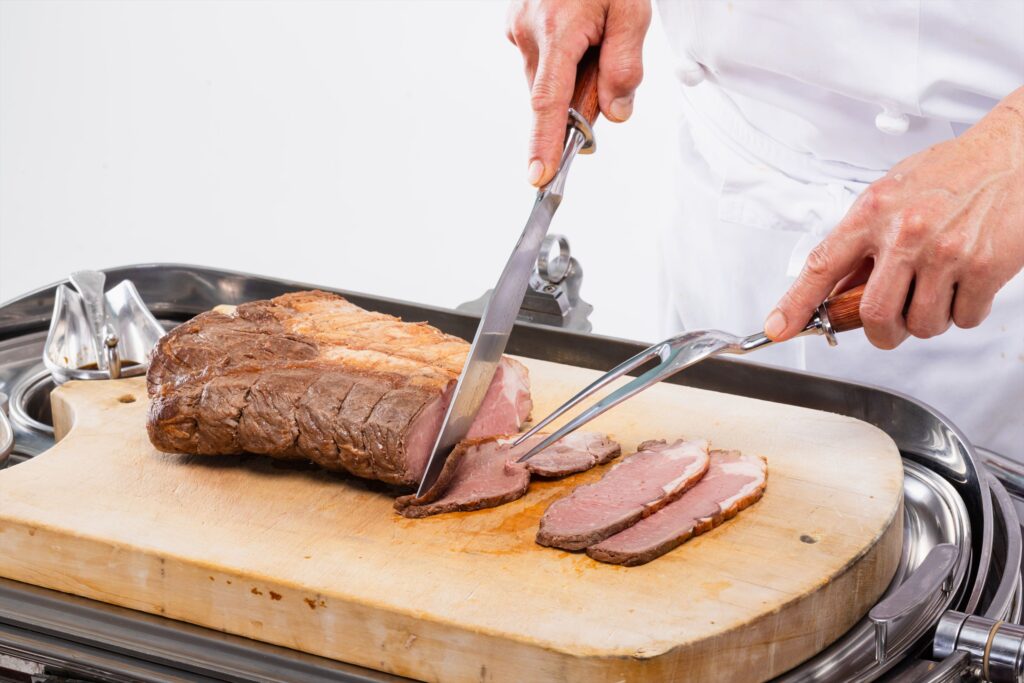 ランチタイムでは、茨城県が誇るブランド牛「常陸牛」のローストビーフがお楽しみいただけます。常陸牛はきめ細やかな肉質と絶妙なバランスで入った「サシ」が特徴で、脂は融点が低く、口に入れた瞬間に「甘み」となって広がります。じっくりと低温で焼き上げた大判のローストビーフのブロックを、シェフがお客様の目の前で、最も美味しい厚みにカッティングしてご提供いたします。