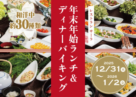 レストラン サーラでは、2025年12月31日(水)から2026年1月2日(金)の期間、『年末年始ランチ&ディナーバイキング』を開催いたします 。 和洋中、約30種類のバラエティ豊かなメニューが勢ぞろい 。シェフこだわりのホテルグルメを心ゆくまでお楽しみいただけます。ランチは嬉しいソフトドリンクバー付きです 。年末年始期間はレストランサーラで、ご家族やご友人と、贅沢なひとときをお過ごしください。